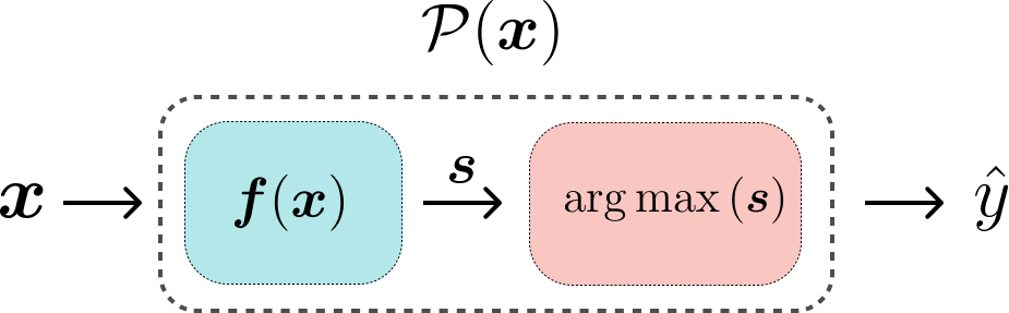 \[\hat{y} = \arg\max \boldsymbol{s}\]Thus, our original prediction function \(\mathcal{P}(\boldsymbol{x})\) can now be understood as a two-step process: \(\mathcal{P}(\boldsymbol{x}) = \arg\max(\boldsymbol{f}(\boldsymbol{x}))\).